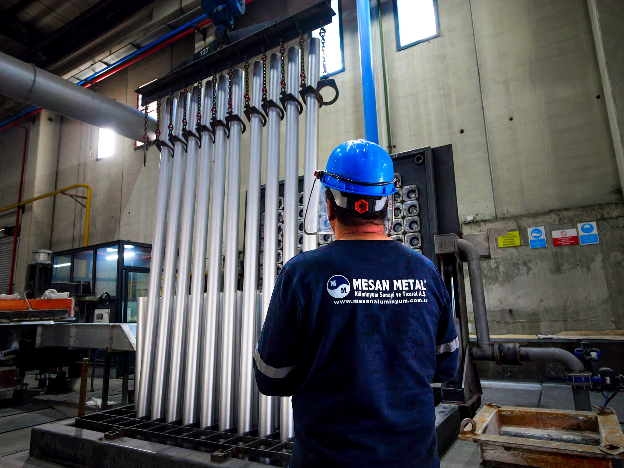 35 tonluk iki adet döküm ocağımız ile Ø114, Ø 127, Ø 152, Ø 203 mm ölçülerinde uluslararası standartlara uygun olarak billet üretimini gerçekleştirmekteyiz. Mesan Çorlu Tesisi; Dört presle toplam yılda 22.000 ton üretim kapasitesine sahip olan tesisimiz, 1000 ve 6000 serisi hammaddelerle çalışarak, 30 gr/mt ile 20 kg/mt arasında değişen geniş bir yelpazede alüminyum profiller üretebilme kabiliyetine sahiptir. KALIP ÜRETİMİ: HASSAS DETAYLAR, YÜKSEK STANDART Alüminyum profillerimizin istenilen ölçü ve toleranslarda üretilmesi, mükemmel yüzeyler elde edilmesi için kalıp tasarımı ve yapımı, üretim sürecimizin kilit noktasını oluşturur. Gelişmiş CNC makineleri, torna, freze, dalma erezyon, tel erezyon gibi modern kalıp tezgahları ile standart ve özel maksatlı kalıplar tasarlayıp üretiyoruz. Teknoloji ve Pratik Uygulama: Kalite Kontrol ve Bakım: Mesan Metal olarak, kalıp ustalığımızla profillerimizin en üst düzeyde kalite ve performansı sağlamak için çalışıyoruz. Mesan Metal, aylık 1000 ton alüminyum profil boyama kapasitesiyle öne çıkmaktadır. Profesyonel ekibimiz, 8 metre uzunluğa kadar çeşitli renk seçeneklerinde, özel tasarımlar veya RAL kodlarına uygun olarak Qualicoat standartlarına göre boyama işlemini gerçekleştirmektedir. Profiller, çevre dostu kimyasallarla hazırlanan ön işlem banyolarından geçirilerek, son teknoloji power and free sistem konveyör-fırın sistemimizde özenle boyanmaktadır. Ekipman ve Özellikler Mesan Metal olarak, kaliteli boyama hizmetimizle sektörde öncü konumumuzu sürdürmekteyiz. Eloksal, alüminyum metalinin yüzeyini elektrokimyasal bir süreçle homojen bir oksit tabakasıyla kaplama işlemidir. Klasik eloksal yöntemi, alüminyum profil yüzeylerine 1-25 mikron arasında eloksal kaplama sağlar. Bu kaplama, alüminyuma estetik bir görünüm katar, çizilmelere ve korozyona karşı direnç kazandırır; aynı zamanda dayanıklı yüzey kaplama tekniklerinden biridir. Eloksal Tesisimiz: Eloksal tesisimiz, yılda 15.000 ton yüzey işleme kapasitesine sahiptir. 2 adet otomatik polisaj makinası ile parlak yüzeyli eloksal, 1 adet satinaj makinası ile satine efektli eloksal işlemleri gerçekleştirebilmektedir. 3 adet eloksal banyosu ve 3 adet 15000 amper redresör ile eloksal kaplama yapılırken, 3 adet renk banyosu da mevcuttur. Tesisimizde 7 metre uzunluğa kadar olan profillerden mat ve parlak yüzeyler elde edilebilmektedir. Bu süreçte doğal alüminyum rengi (natürel), siyah, sarı, kahverengi, bronz ve bunların birden fazla tonu elde edilebilir. Kalite ve Güvence: Eloksal tesisimizde gerçekleştirilen işlemler, ömür boyu dayanıklılık, UV direnci ve renk kalıcılığı gibi özellikleri ile Avrupa QUALANOD standartlarına ve TSE garantisi altındadır. Mesan’ın eloksal sanatı, yüzeyin zarafetini ve dayanıklılığını bir araya getirerek sektörde fark yaratmaktadır. Ekstrüzyon ile oluşturulamayan profil yüzeyindeki detaylar, işleme merkezleri ve eksantrik presler kullanılarak talaş kaldırma yöntemiyle gerçekleştirilir. Bu işlemler, profilin delik, slot, kanal veya kilit yuvası gibi çeşitli formlarla donatılmasını sağlar. Kesme, dilimleme, matkap ile delik açma, çapak alma ve ısıl yalıtım bariyeri (fitil) ezme gibi işlemler de mekanik işlem sınıfına dahildir. MAKİNE PARKURU YAPILABİLİRLİK 120mm x 80mm boyutlarına kadar tek operasyonda profil işleme imkanına sahibiz. KAPASİTE Yıllık ortalama 290.000 adet profil işleme kapasitemizle, kalite ve hızı bir araya getiriyoruz.